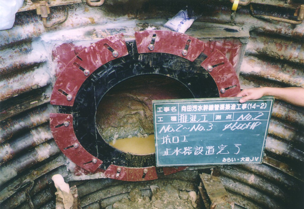 (工事概要) 工事場所:鹿児島県 工期 :平成15年6月〜8月 施工 :株式会社 鹿児島推進開発 土質 :砂質シルト、N値15〜20 土被り :約4.5m 勾配 :約1.2パーミル 管径×長:φ600mm 管種 :推進用ヒューム管 工法 :オーガ一工程式 推進機種:SH−716型 路線延長:約217.0m×2スパン、最大112.5m 発進立坑:小判型ライナープレート 2,500×6,111mm 到達立坑:小判型ライナープレート 2,500×6,111mm(幅2,500mm方向に到達)